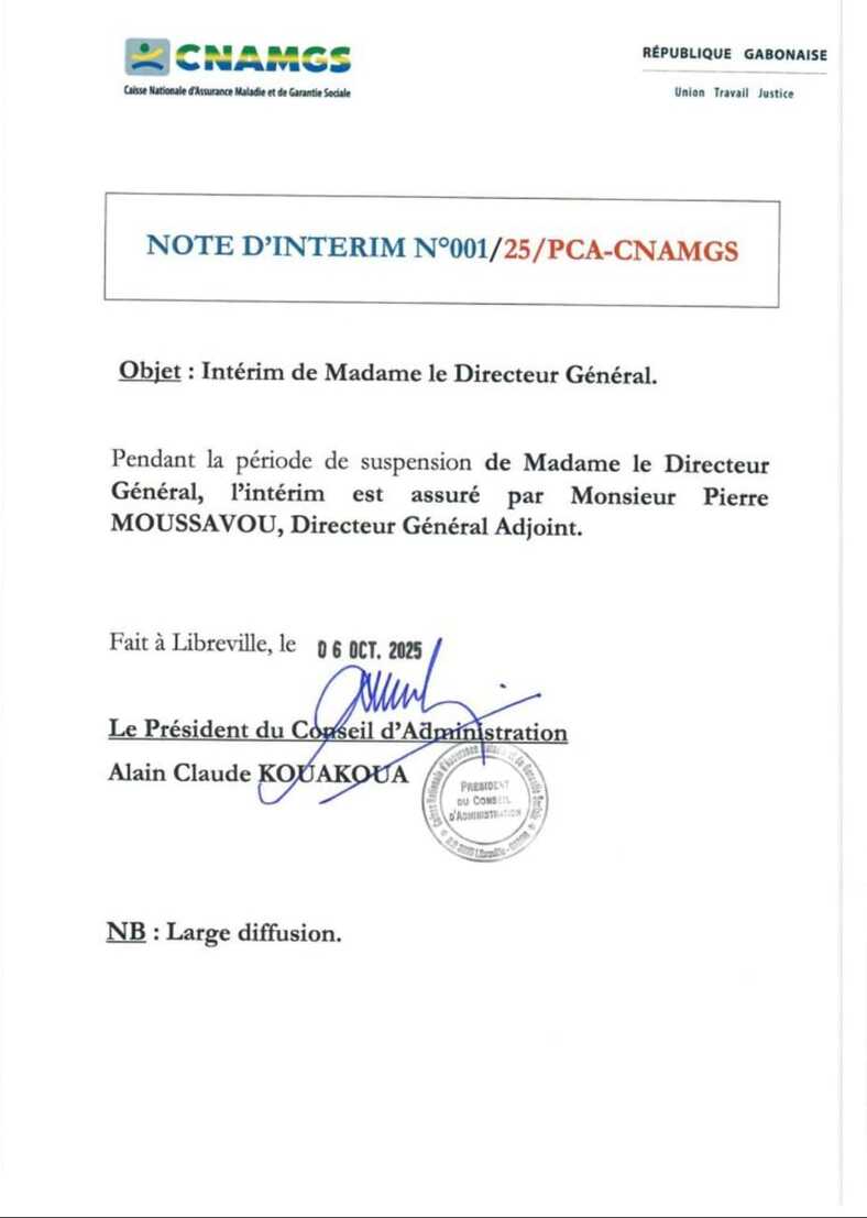 La décision a été rendue publique ce lundi 6 octobre 2025 à Libreville. Selon une note d’intérim n°001/25/PCA/CNAMGS, signée du Président du Conseil d’administration, Alain Claude Kouakou, M. Moussavou prend les commandes de l’institution jusqu’à nouvel ordre.