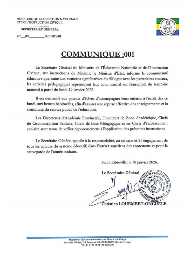 Dans un communiqué n°001, le ministère indiquait pourtant que « suite aux avancées significatives du dialogue, les activités pédagogiques reprendront leur cours normal à partir du 19 janvier 2026 », déclaration réaffirmée par le secrétaire général du ministère.