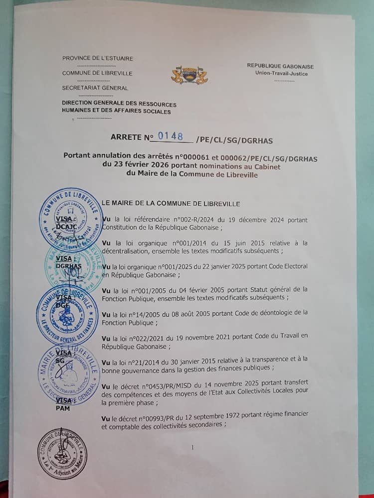 La Direction générale des ressources humaines et des affaires sociales (DGRHAS) de l’Hôtel de ville de Libreville a procédé à l’annulation des nominations au cabinet du maire de la commune, conformément aux arrêtés n°000061 et 000062/PE/CL/SG/DGRHAS du 23 février 2026.