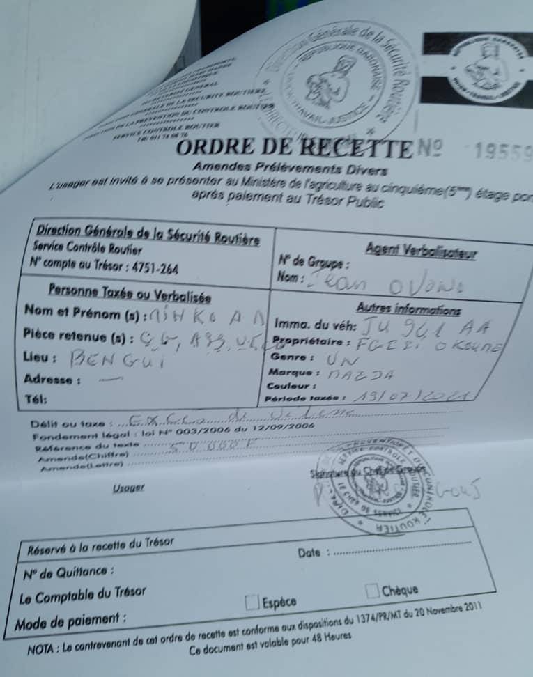 Au moment d’établir la contravention, les agents découvrent avec stupéfaction que le véhicule appartient au FGIS. Interrogés, les passagers expliquent qu’ils l’ont loué pour se rendre dans la province du Woleu-Ntem, au nord du pays. Montant de la transaction : près de deux millions de francs CFA, selon la Direction de la sécurité routière. Une déclaration qui a laissé les agents sans voix, sachant que la mission du FGIS n’a rien à voir avec la location de voitures.