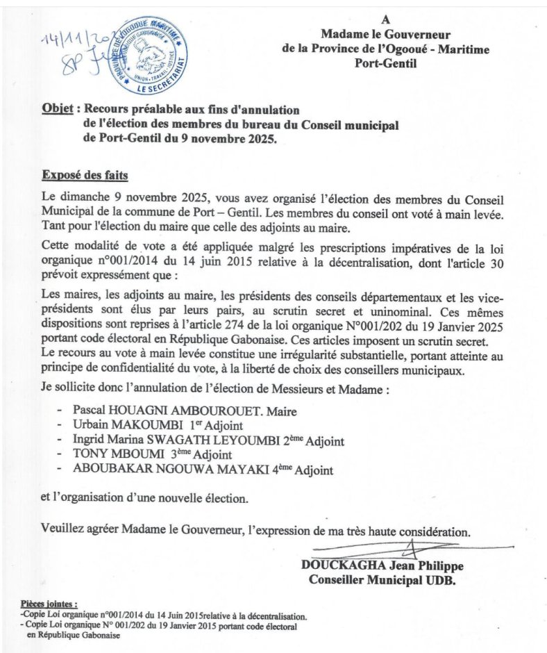 Selon M. Douckagha, le vote à main levée relève d’une irrégularité majeure, remettant en cause la confidentialité du vote et la liberté d’expression des conseillers. Son recours a été transmis au gouverneur de l’Ogooué-Maritime le 14 novembre.