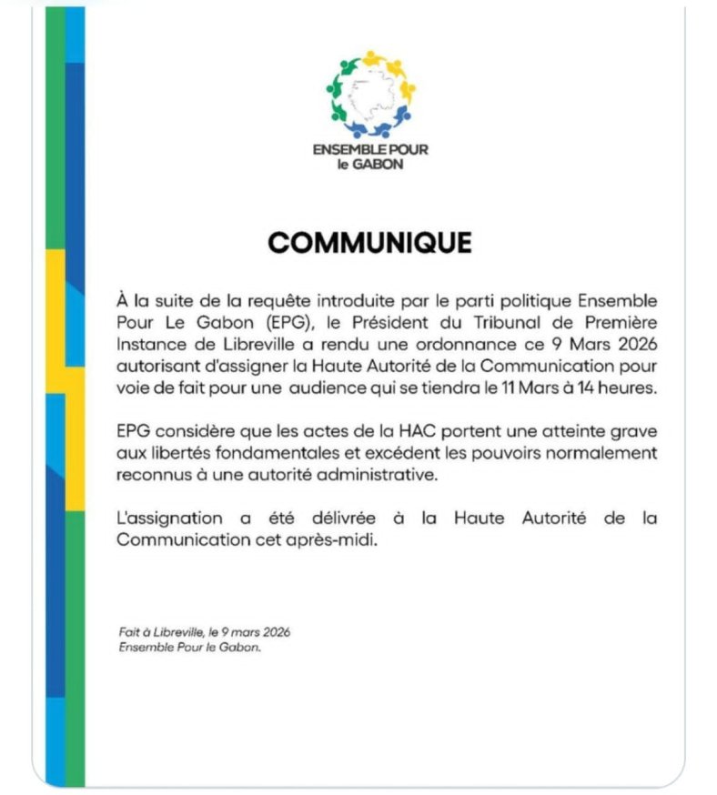 Le président du mouvement Ensemble pour le Gabon (EPG) a assigné en justice la Haute Autorité de la Communication (HAC). L’audience est prévue ce mercredi 11 mars 2026 au Palais de justice de Libreville, à partir de 14 heures.