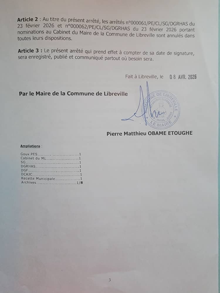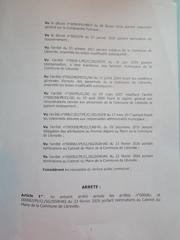 La Direction générale des ressources humaines et des affaires sociales (DGRHAS) de l’Hôtel de ville de Libreville a procédé à l’annulation des nominations au cabinet du maire de la commune, conformément aux arrêtés n°000061 et 000062/PE/CL/SG/DGRHAS du 23 février 2026.